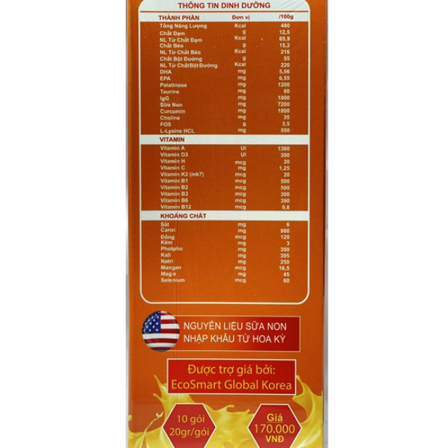 Sữa bột (50-55%), Whey protein, Đường Isomalt, Chất xơ hòa tan (FOS), L- Lysine HCL,Taurine, Choline, Beta-Glucan, Sữa non, IgG 1800 mg/100g, Nano curcumin (chiết xuất từ nghệ vàng) 1800 mg/100g. Khoáng chất (Canxi, Magie, Natri, Kali , Sắt, Kẽm, Đồng, Mangan). Vitamin (Vitamin K2 (Mk7), Vitamin C, Vitamin B1, Vitamin B2, Vitamin B3, Vitamin B5, Vitamin B6, Vitamin B12, Axit folic, Vitamin A, Vitamin D3, Vitamin E). Hương vani tổng hợp dùng trong thực phẩm.